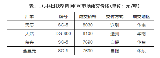 據(jù)找塑料網(wǎng)成交數(shù)據(jù)顯示(見表1)今日上午國內(nèi)PVC市場成交價格繼續(xù)拉高,期貨震蕩下行,但依舊阻擋不了PVC市場迫切上漲的行情。目前來看,場內(nèi)貨源不多,價格堅挺,終端抵觸,整體出現(xiàn)有價無市局面,今日華東電石法SG-5主流價格維持在7700-7800元/噸(自提);華南市場電石法SG-5主流成交價7950-8000元/噸(自提)。找塑料國內(nèi)PVC實際成交指數(shù)為978點,較上一交易日上調(diào)5點。