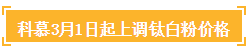 科慕(Chemours)宣布,自2017年3月1日起,上調(diào)北美、加拿大、亞太、拉丁美洲、歐洲、中東、非洲銷售的所有科慕(Chemours)Ti-Pure?鈦******價格,或另見合同要求。調(diào)價詳情為: 北美和加拿大:上調(diào)0.06美元/磅;亞太:上調(diào)150美元/噸;拉丁美洲、中東、東歐和撒哈拉以南非洲:上調(diào)200美元/噸;西歐和中歐、土耳其和北非:上調(diào)200歐元/噸。