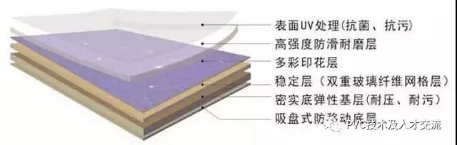 多層復合型PVC地板:有多層結(jié)構的地板,一般由4~5層結(jié)構疊壓而成,一般有耐磨層(含UV處理)、印花膜層、玻璃纖維層、彈性發(fā)泡層、基層等。