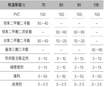 蘇朝北[3]~ [4]等經(jīng)過一系列研究,用國產(chǎn)鈣/鋅穩(wěn)定劑,配合適當(dāng)溫度等級(jí)的增塑劑,分別制得了70,90,105℃的環(huán)保PVC護(hù)套料,環(huán)保要求符合RoHS規(guī)定,性能可滿足GB/T 8815-2002的要求。