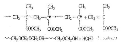 解聚反應系先在大分子未端斷裂,,然后按連鎖機理迅速脫除單體,在聚合上限溫度以上尤其容易進行?,F(xiàn)以聚甲基丙烯酸甲酯與聚甲醛的解聚反應為例,其自由基脫除單體的反應如下: