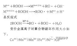 氫過氧化基團引起的鏈的斷裂導致分子量降低,其均裂的主產(chǎn)物為醇、醛、酮,最后氧化成羧酸。羧酸對金屬催化氧化起著主要作用。