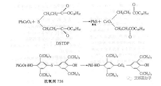 鉻黃顏料或鉬鉻紅中鉛成分與抗氧劑如硫代二硬脂酸酯DSTDP反應