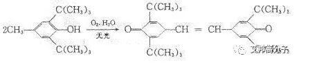 酚類穩(wěn)定劑的自動氧化,是促進白色或淺色制品色變的重要因素,這種色變在國外常稱為“Pinking”(泛紅),它是由諸如BHT抗氧劑(2-6-二叔丁基-4-甲基苯酚)氧化產(chǎn)物偶合,并形如3,3′,5,5′一均二苯乙烯醌淡紅色反應產(chǎn)物,這種變色僅在有氧和水以及無光的情況下發(fā)生,曝置在紫外光下,淡紅的均二苯乙烯醌迅速分解成黃色的單環(huán)產(chǎn)物。