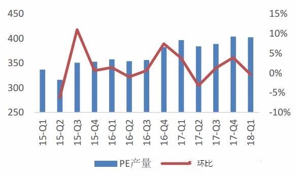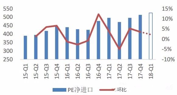 數(shù)據(jù)顯示,中國(guó)聚乙烯進(jìn)口依存度在40-45%左右,進(jìn)口依賴(lài)度較高。2018年1月份聚乙烯進(jìn)口128.9萬(wàn)噸,環(huán)比增加17%。2月份由于春節(jié)假期因素進(jìn)口量下降明顯,但3月份從遠(yuǎn)洋貨物的到港情況來(lái)看,進(jìn)口量仍存較高預(yù)期。