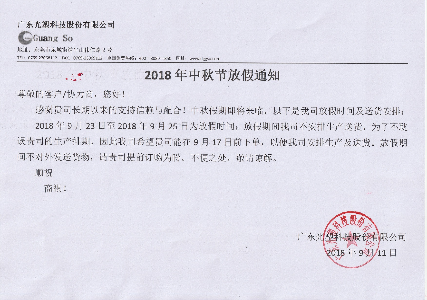2018年9月23日至2018年9月25日為放假時間;放假期間我司不安排生產(chǎn)送貨,為了不耽誤貴司的生產(chǎn)排期,因此我司希望貴司能在9月17日前下單,以便我司安排生產(chǎn)及送貨。放假期間不對外發(fā)送貨物,請貴司提前訂購為盼。不便之處,敬請諒解。