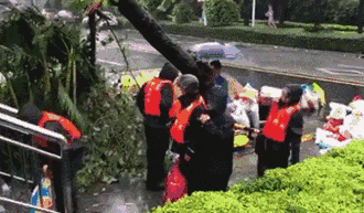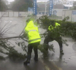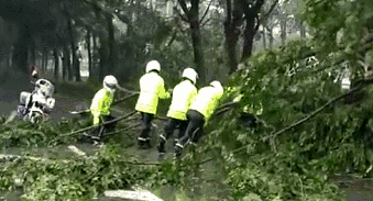 為了市民們的行車安全,交警蜀黍們正在努力清除被大風吹倒的樹