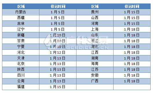 內(nèi)蒙古,西藏,吉林,遼寧等地1月5日停運(yùn),新疆,甘肅,寧夏等地1月10日停運(yùn)。河北1月12日停運(yùn),天津,北京,陜西,四川,云南等地1月13日停運(yùn)。福建,貴州,山西,河南等地1月15日停運(yùn)。上海,山東,浙江,湖北,江西,湖南,海南,江蘇,安徽,廣西等地1月18日停運(yùn)。